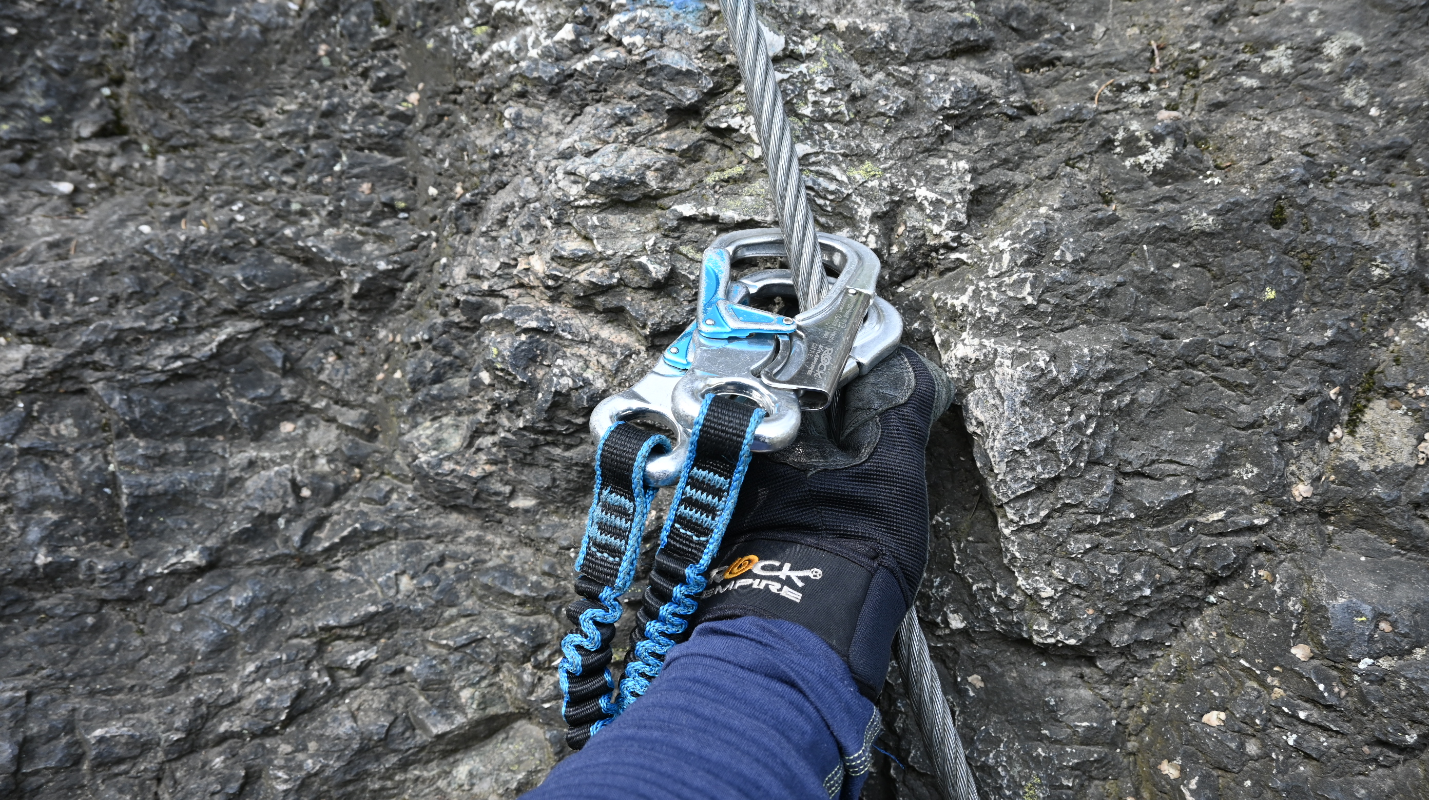Nepodceňujme jištění ani na vyloženě lehkých úsecích, jistěme se i na vrcholech při focení či během odpočinku. V případě odsednutí do kramle nebo příčky na žebříku buďme stále zajištění i do ocelového lana. Kramle slouží pouze k postupu, nejsou určeny k zachycení pádu. -
