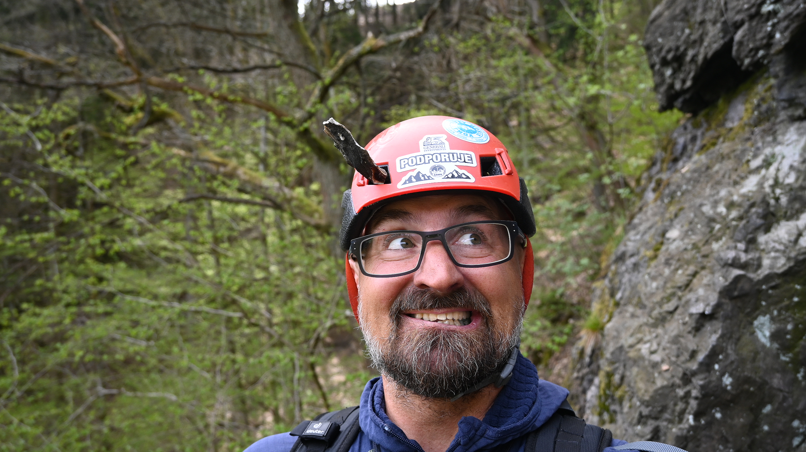 Používáme pouze certifikované vybavení (helmu, sedák, prsák, tlumič pádu, smyčky i karabiny).