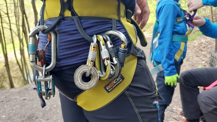 Před nástupem si vzájemně zkontrolujeme správné oblečení a zapnutí úvazku včetně jeho správného spojení s tlumičem pádu.